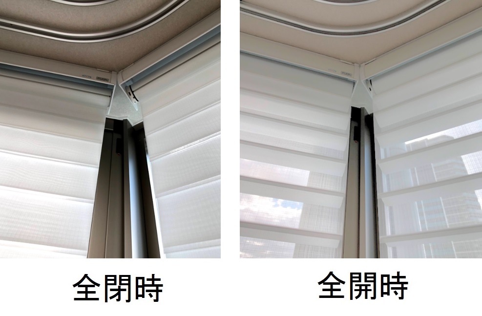 もう少し詳しく解説すると、直線部分でヘッドボックスを分割した場合に生じる生地間の隙間は約20~30mm程度(※手動と電動で異なる)となりスラットの開閉にかかわらず一定していますが、135°の角度が付いたコーナー分で分割する場合は、スラットを立体的に開いた全開時で約35~40mm、ヘッドボックス後方でスクリーンが平面になるスラット全閉時で約60~65mm、の隙間が生じるという特性をご説明させていただいております。