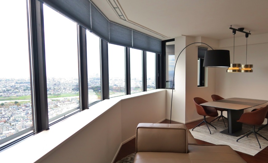 眺望の素晴らしい「高層マンション」上層階の大開口窓に、ルーセントホーム『シェルシェード』の「電動リモコンタイプ(電池式)」を4分割で納品させていただきました。 遮熱性、断熱性に優れたハニカムシェードの採光タイプ(セミ・オパーク)は、眩しい...