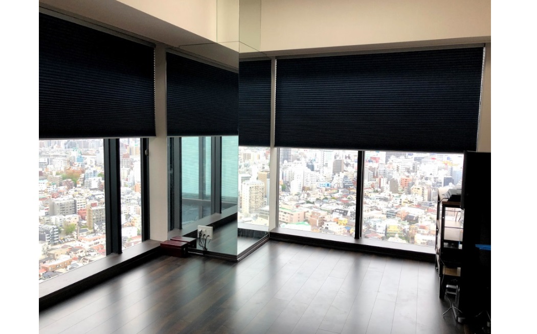 「ハニカムシェード」電動タイプ遮光セルの採用で電動シャッターの雰囲気 ルーセントホームの『シェルシェード』電動リモコンタイプの納品事例。 高層マンション(上層階)、角部屋の大開口窓でご採用いただきました。カーテンボックス周辺には電動窓周り品... -