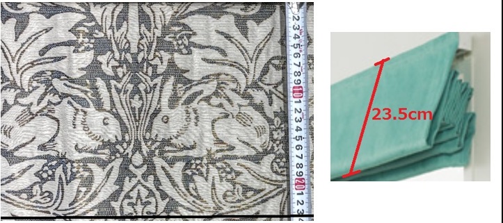 遮光裏地は併用していないので日中に幕体を降ろした時はブラザーラビット全体の柄域が判りにくいですが、畳み上げた上部は背後の生地が遮光の役割を果たすため柄がはっきりと楽しめます。