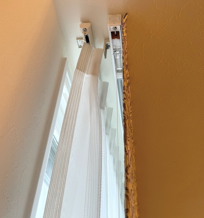 今回、窓周りスタイルの組合せとしては、ローマンシェードを前幕に配し、ベランダへの手軽な出入りができる両片開きのレースカーテンを後幕に組合わせています。