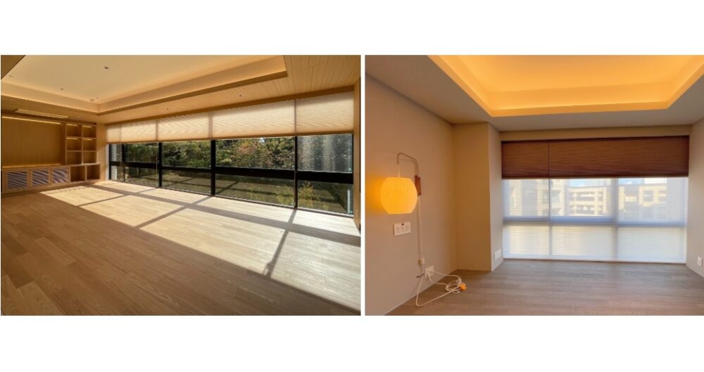 続いて、寝室の窓に上部シースルー、下部遮光のツインスクリーンを採用したイメージはこちら。