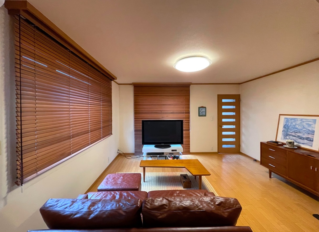 築20年戸建の窓周りリニューアル事例では、カーテン&レースの組合せからWRCウッドブラインドに入替えを行い、家具との調和の良いをご採用いただきました。