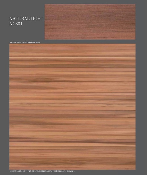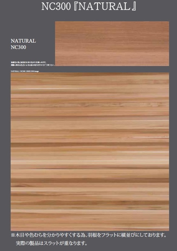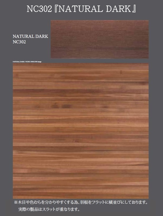「NC302」・NATURAL DARKのスラットは、『ウエスタンレッドシダー(WRC)』本来の素朴な素地の上に、低光沢の「UV塗装」を施し、深めの茶色味を加えたカラーで、空間に重厚な雰囲気を与えます。