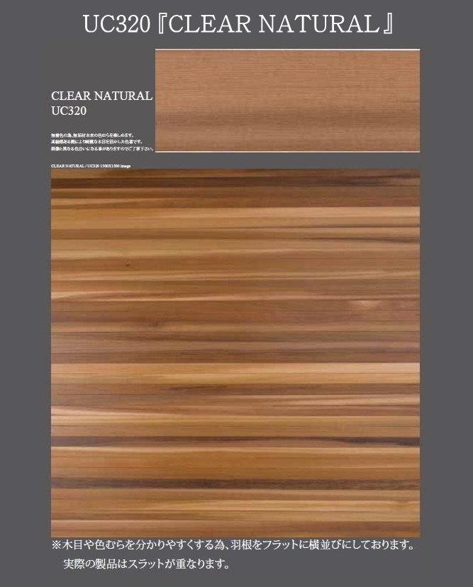「UC320(CLEAR NATURAL)」は、無着色・光沢仕上げの「UV塗装(クリア)」を施し、スラット表面の保護(強化)を向上させたスラットです。