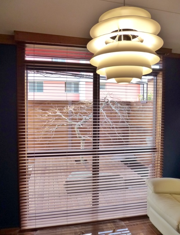 リビングのウッドブラインドのスラットの越しに見るその佇まいは、昼夜を問わず、室内外を融和させ、「光の陰影と幻想的な風景」を楽しめる、見事な和洋折衷の設えとなり完成されました。