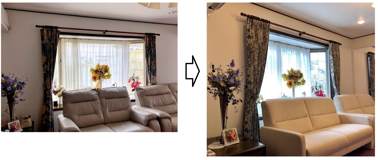20年以上愛用した、青ベースの花柄輸入プリントからの掛け替えで、壁紙の貼り替えとソファの買い替えに合せて、新しいカーテンを新調しようということになりました。