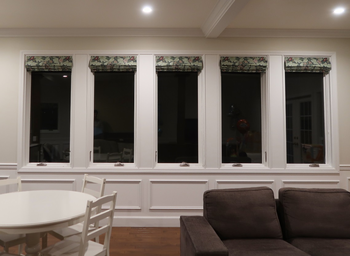 装飾建材で縁取られた7つの窓枠に、『レスター』の織物ファブリックをローマンシェード仕立てで納品させていただきました。