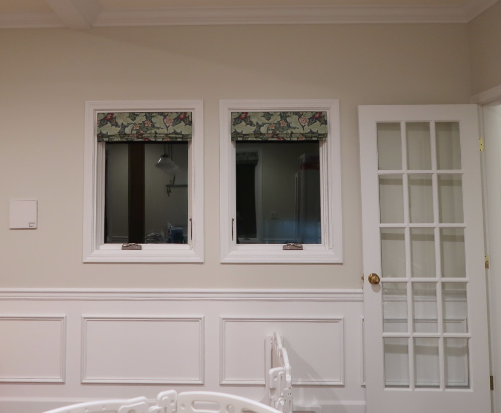 ローマンシェードは、日中畳み上げたときに、幕体の最上部のみが見える特徴を持つため、今回は7窓全ての柄取りを指定してまとめました。