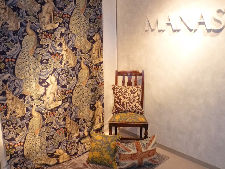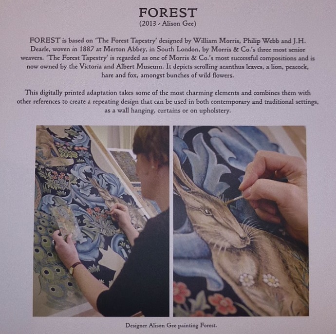 メインのディスプレイに使用されたファブリックは、モリスの「ファブリック コレクション」の表紙を飾っているサンダーソン社・モリス・アーカイヴ管理部門の手掛けた新作ともいえる、『FOREST(2013)』です。
