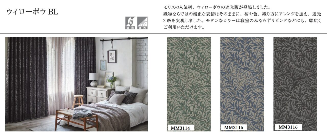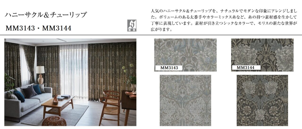 「モリス デザインスタジオ」の新作。『ハニーサクル&チューリップ』と遮光『ウイローボゥ』