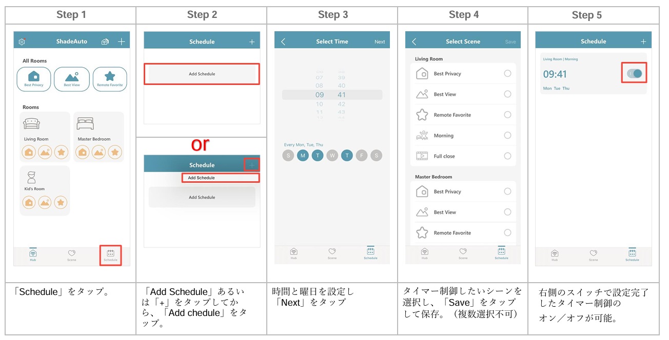 また登録されているシーンポジションは、曜日・時間を指定したタイマー制御で予約することができます。