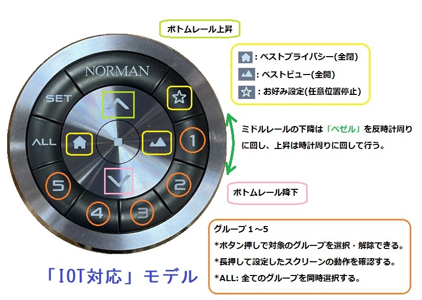 「SmartDial G2 リモコン」の基本操作は従来型リモコンとほぼ同じですが、ミドルレールの上昇と加工操作のみボタンを使用せず丸型リモコンの「ベゼル」(※外周)を左右に回して操作する点が異なります(※メーカーの標準仕様は価格の安い従来型リモコンです)。