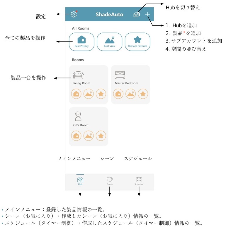 従来型のリモコンまたは「SmartDial G2 リモコン」にオプションの「ShadeAuto HUB」を併用することで専用アプリ(※Shade Auto)を介したスマートフォン操作スマートスピーカーを使用した音声操作といったIOTにも対応することができます(※Wi-Fiとの連携が必要)。