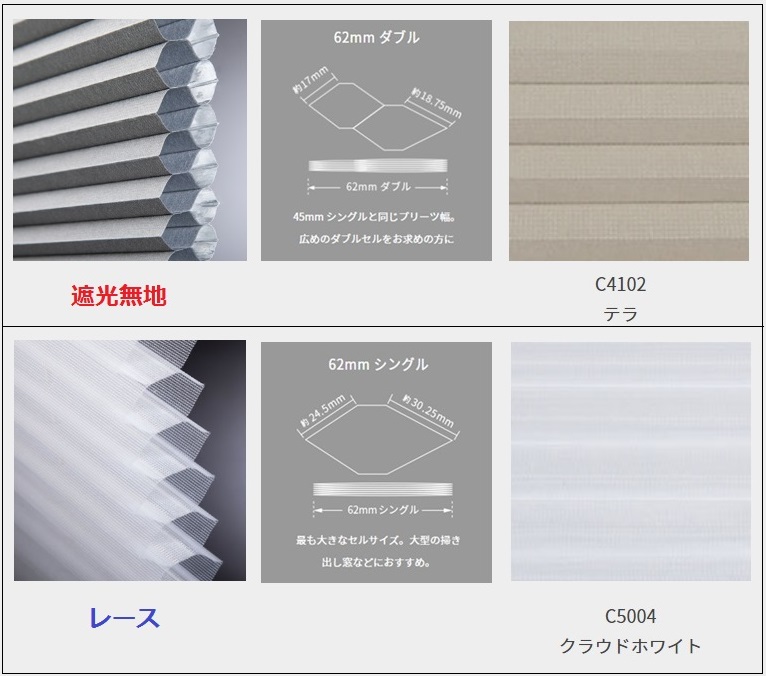 製品仕様と生地の組合せは、断熱性の高い62mmダブルセルの遮光スクリーンと、62mmシングルセルのシースルーです。
