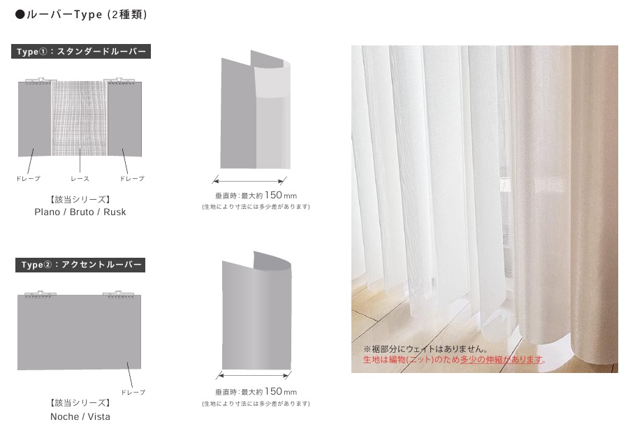 続いて、スアベ・フロールでは、ドレープだけで構成された【アクセントルーバー】の展開があり、ドレープとレースが一体となったスタンダードルーバーの端部などに自由に組合せるスタイルコーディネートにも対応しています。