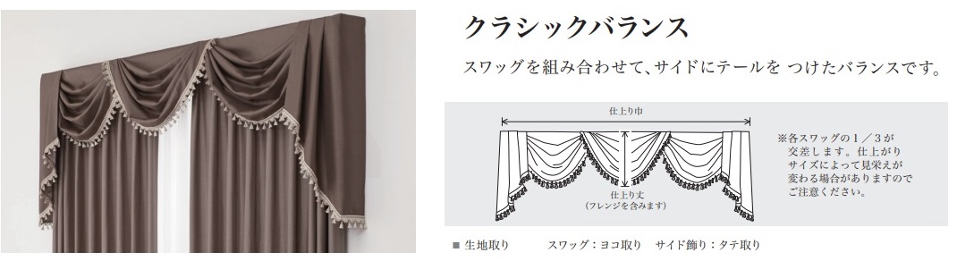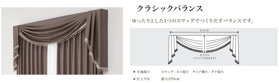 曲線が魅力の装飾バランス。スワッグ&テールと生地の「バイアス」取り。