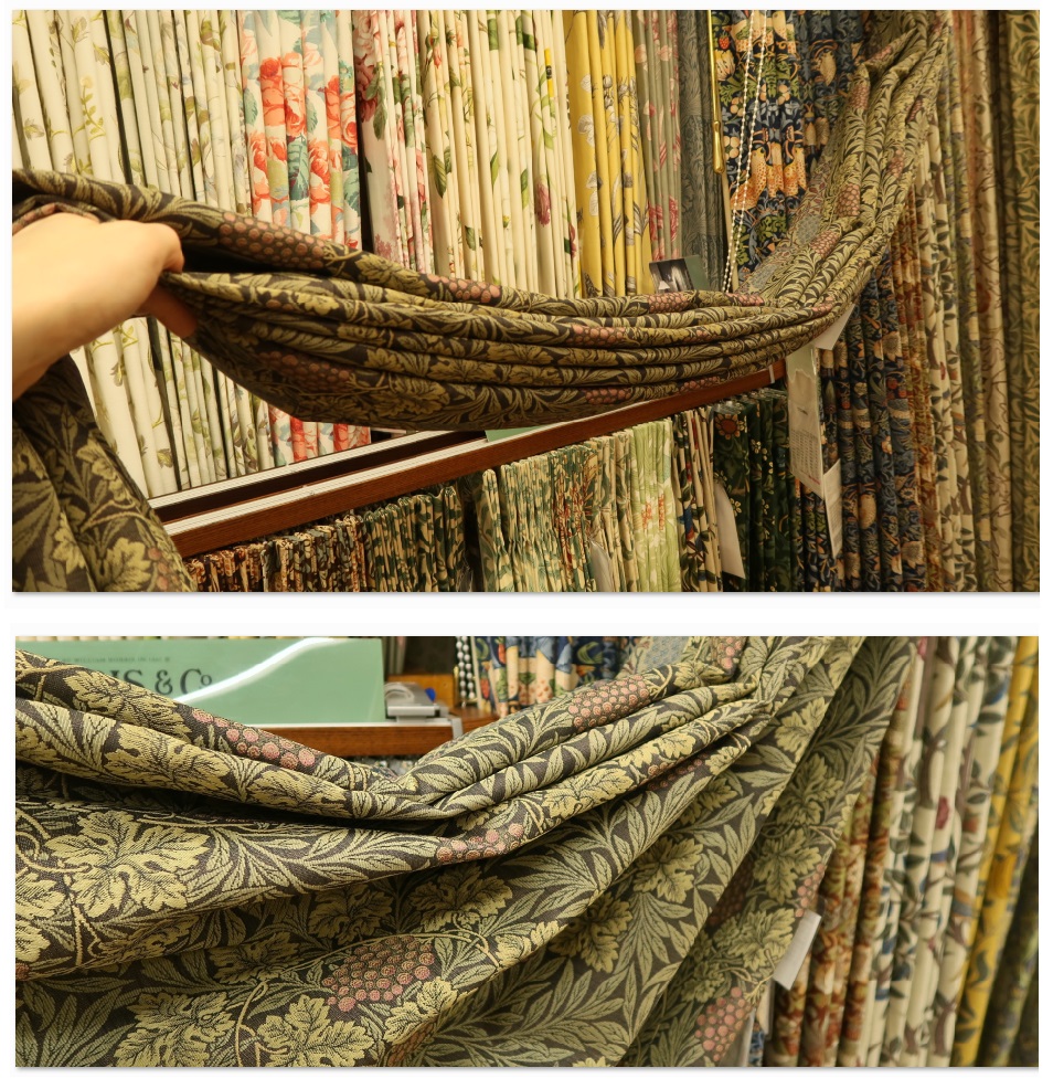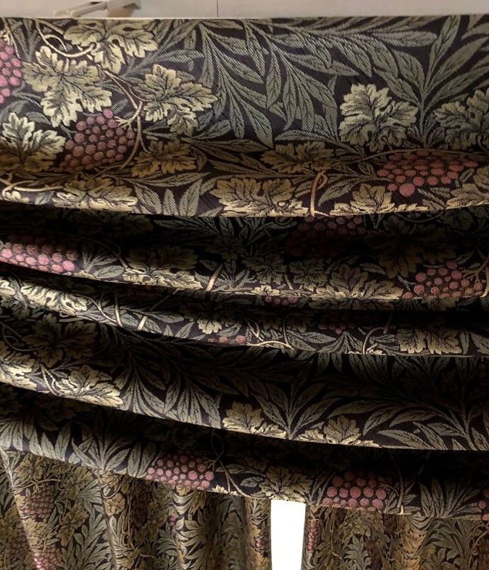 葡萄の葉と柳の葉、それぞれの質感の違いを織りと糸使いで巧みに表現しており、凹凸と光沢のコントラストが美しく、見る角度によって表情が変わる深みの織物ですが、生地が厚く硬いため、緩やかな曲線が魅力のスワッグバランスを仕立てる場合には、以下にご紹介する注意点に配慮する必要があります。
