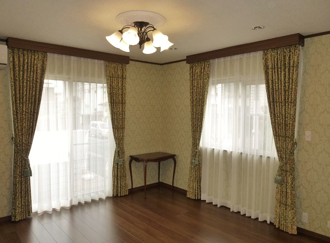 カーテンボックスはすでに設けられていましたが、アンティーク家具と英国調インテリアの雰囲気をより引き立てるため、今回は窓まわりを「装飾バランス」で優雅にくるむスタイルをご提案させていただきました。