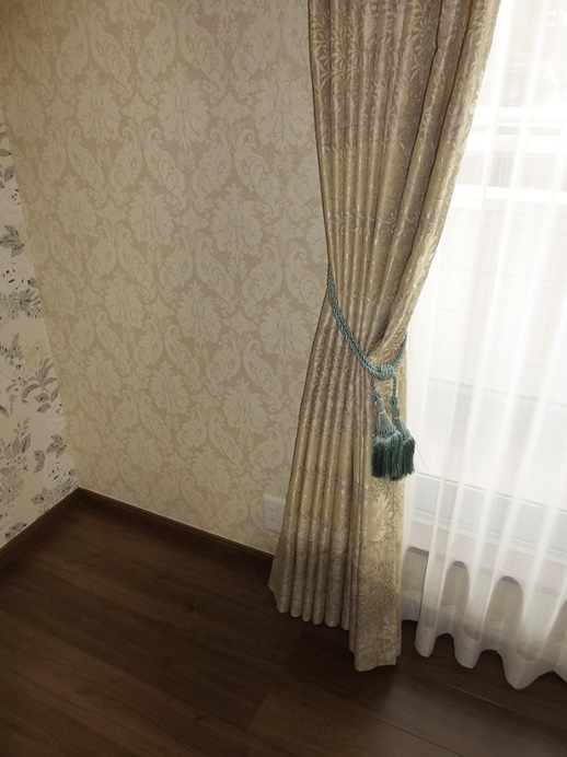 ご入居後に、追加で納めさせていただいた、『装飾バランス』が加わった完成型のウィンドゥ・トリートメントの様子です。