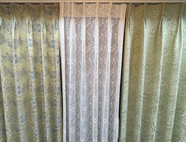2種類の厚地『ラークスパー(LARKSPUR)』と、コーディネートシアー『ラークスパー(LARKSPUR)』レース(MM3166)の縫製展示品を組み合わせたイメージ。